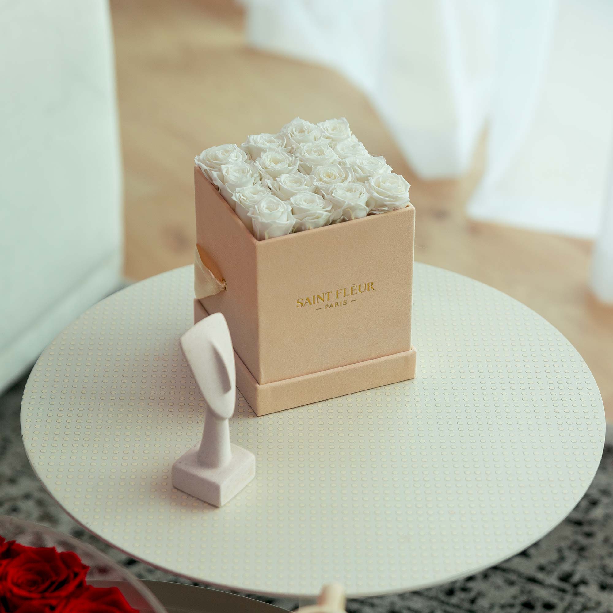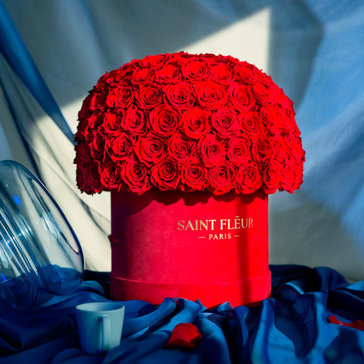 Caring for your flower arrangement is effortless: keep the roses in a stable, room-temperature environment and away from direct sunlight and extreme heat. Dust them lightly and handle the arrangement with care. Refrain from watering or placing the box in contact with light-colored fabrics to ensure the roses remain timeless.