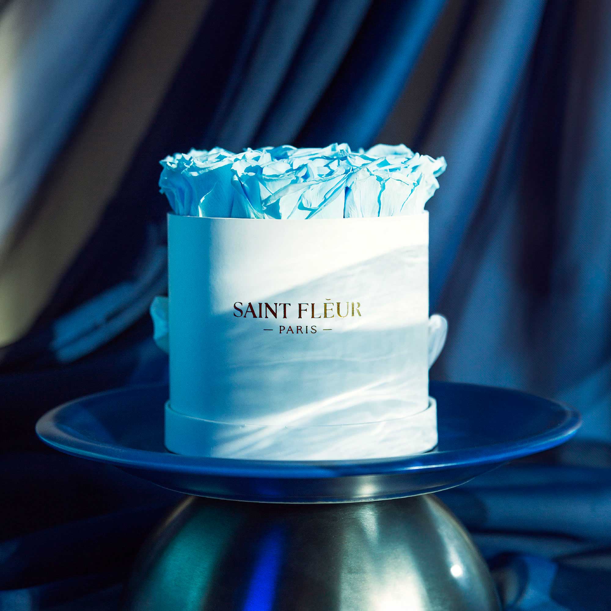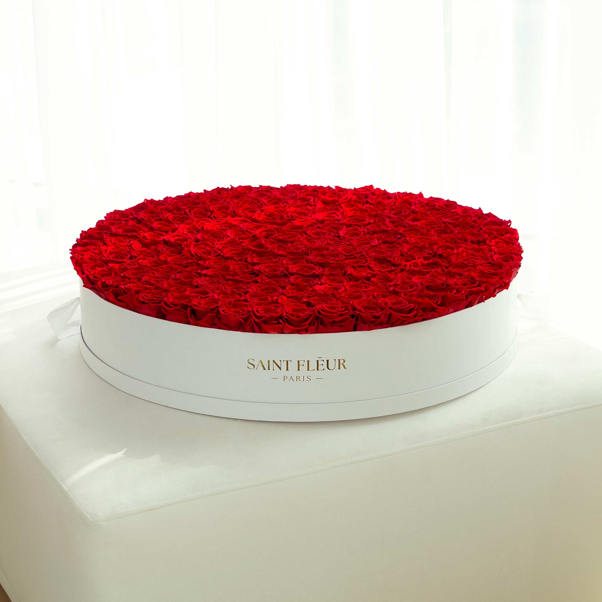 The "Classic Dome" from Saint Fleur is a standout piece with approximately 58 roses arranged into a flawless dome shape. It measures 28 cm in diameter and stands 30 cm tall, making it a substantial yet elegant centerpiece that's sure to draw the eye. This arrangement is perfectly suited for display on a central table or as the focal point in a room, adding a classic touch of sophistication to any interior.