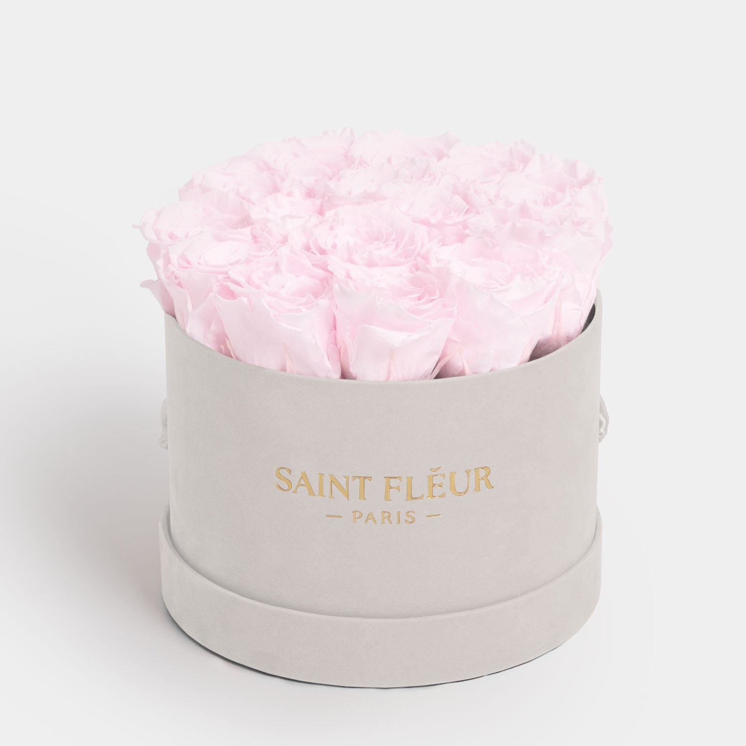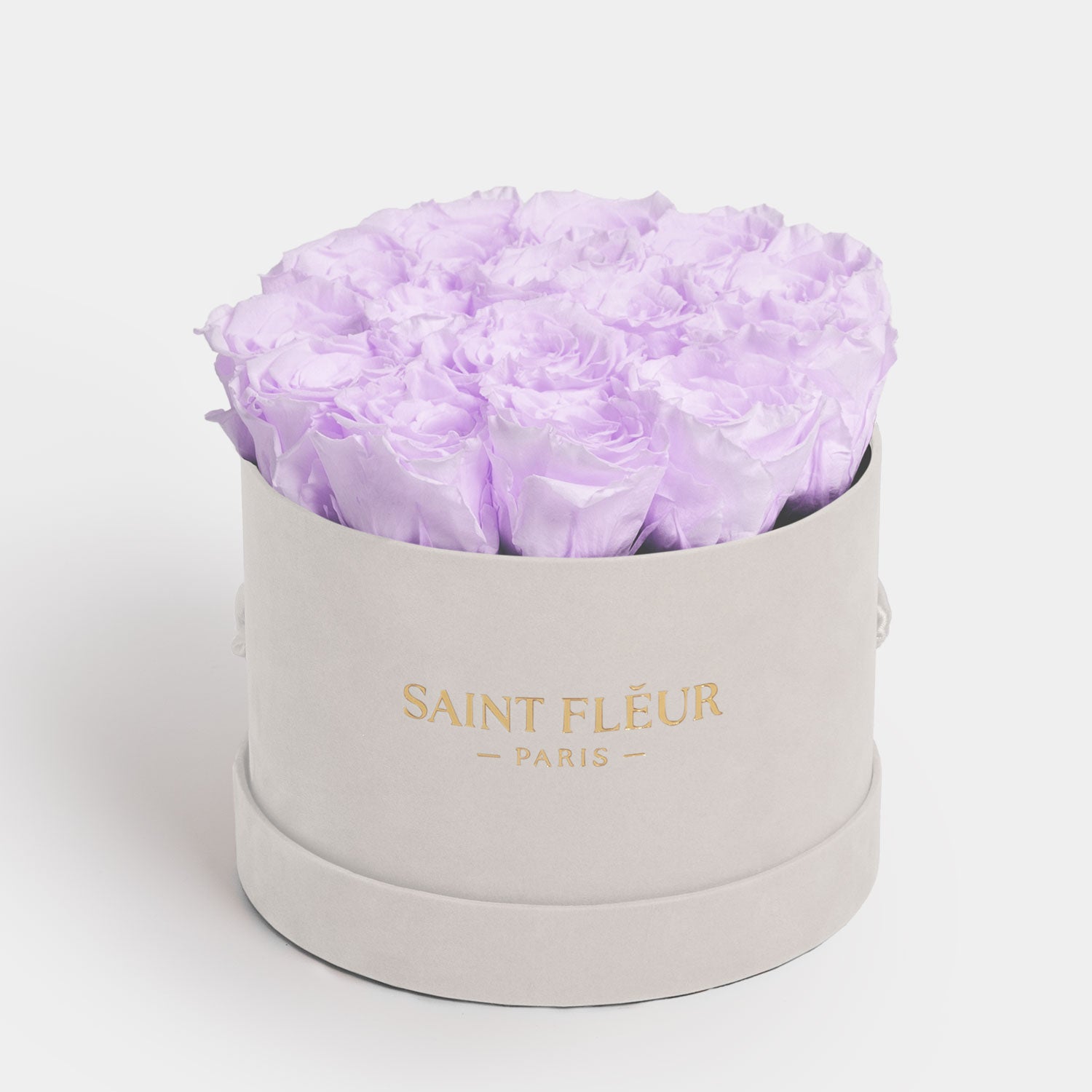 The 'Classic Round' eternal rose arrangement from Saint Fleur is a perfect example of classic elegance and lasting beauty. It includes fifteen carefully preserved roses, giving off a sophisticated and graceful look. These roses are arranged in a traditional round box, showcasing luxury and good taste.