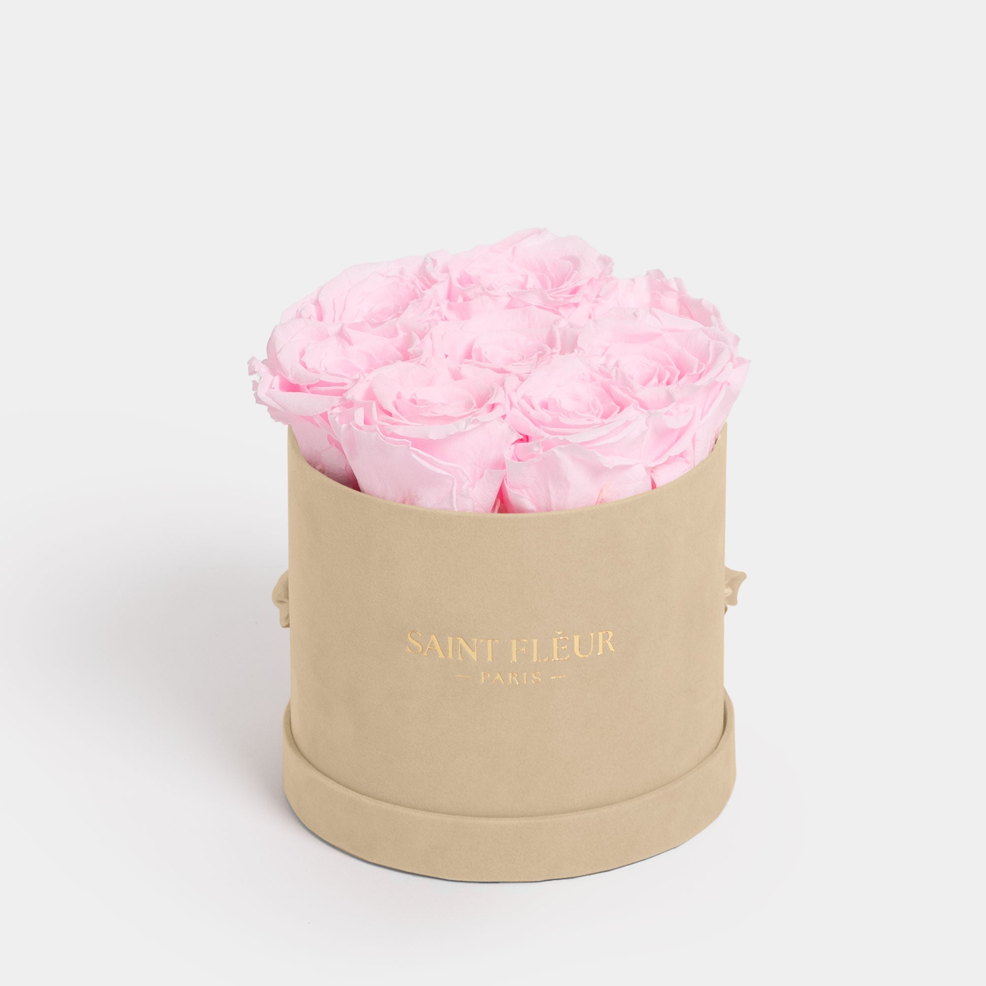 The 'Small Round' eternal rose arrangement by Saint Fleur captures luxury in its most compact form. It boasts seven lush, large-plus red roses, each preserved to perfection, and nestled in a timeless, round box. Designed for longevity, this piece serves as a daily reminder of beauty and grace.