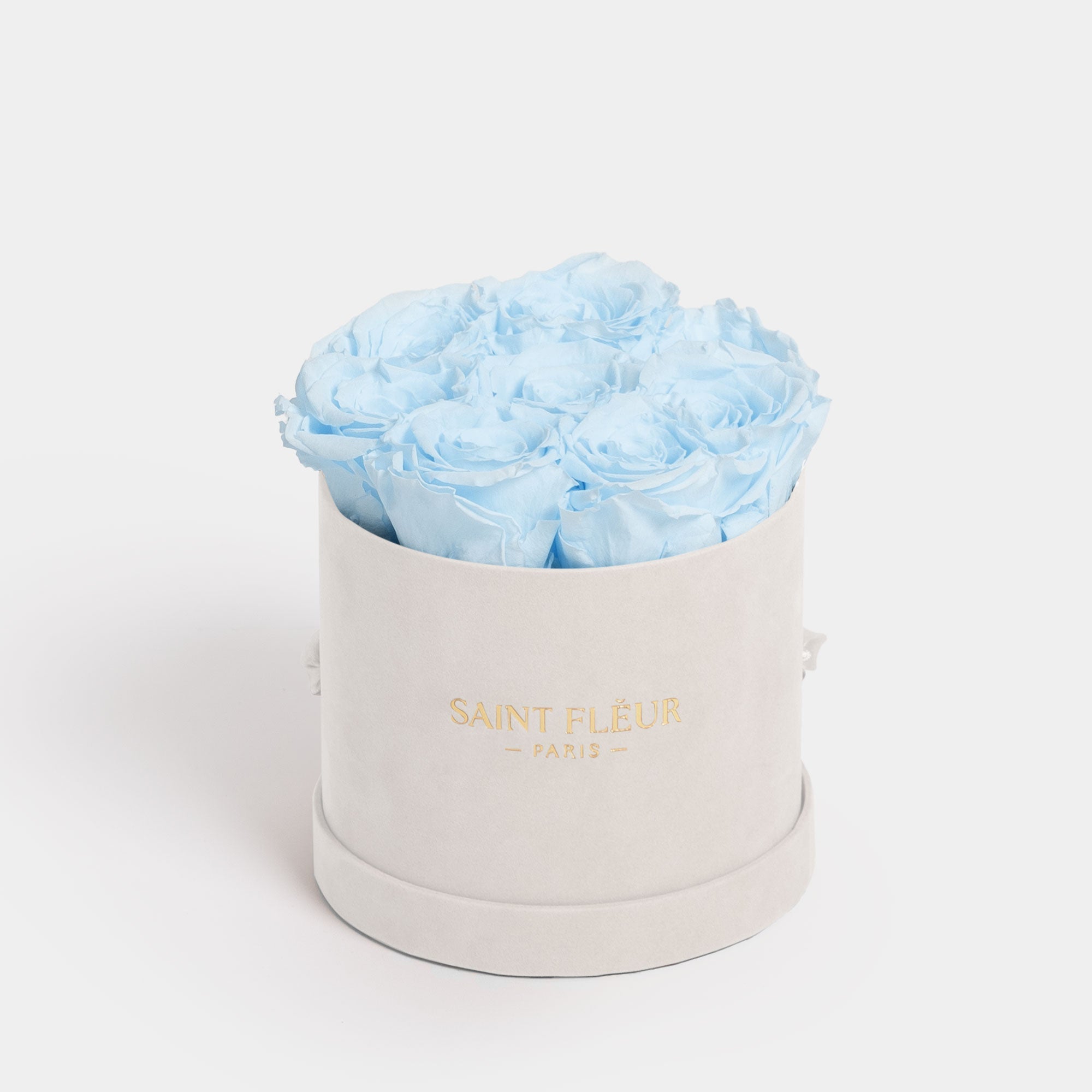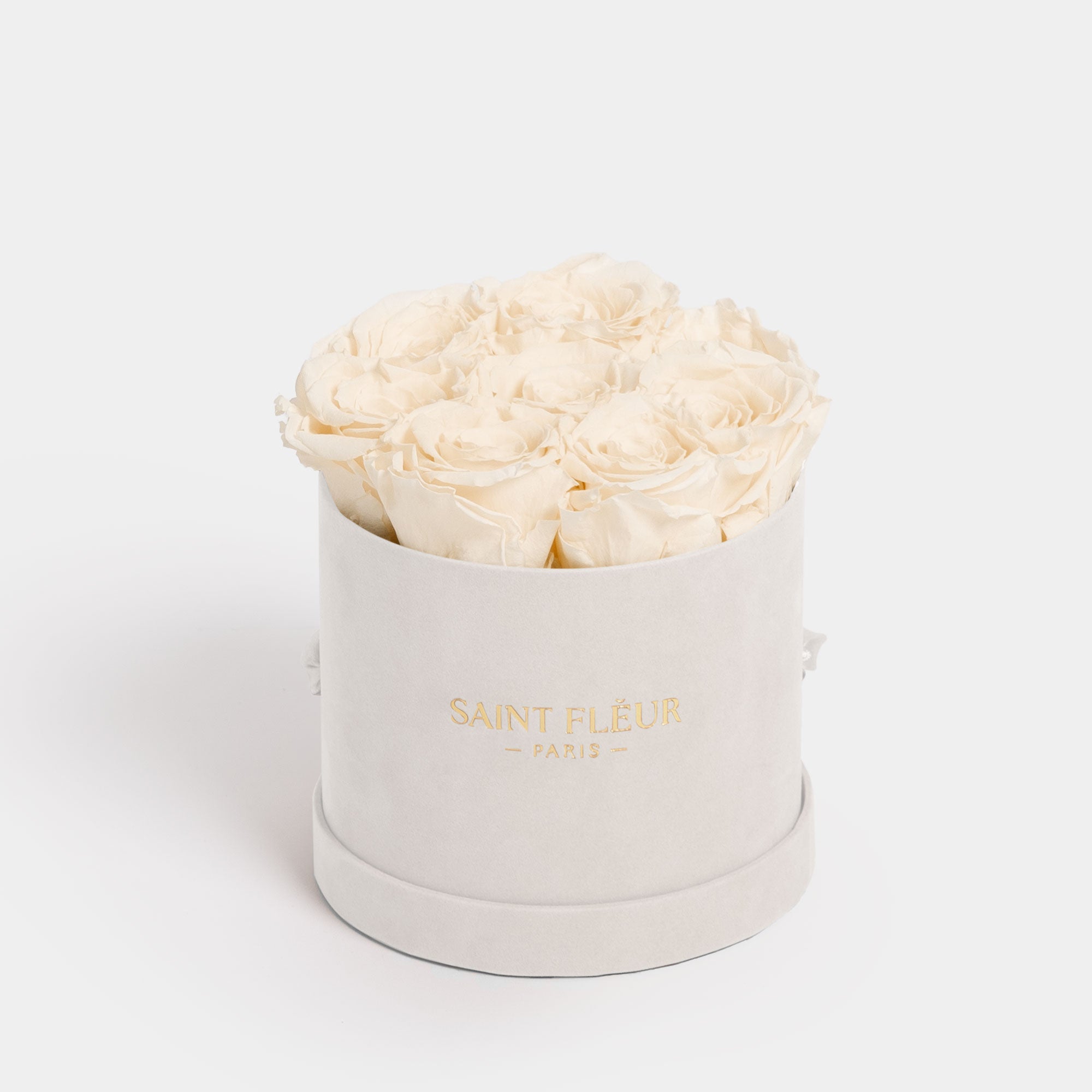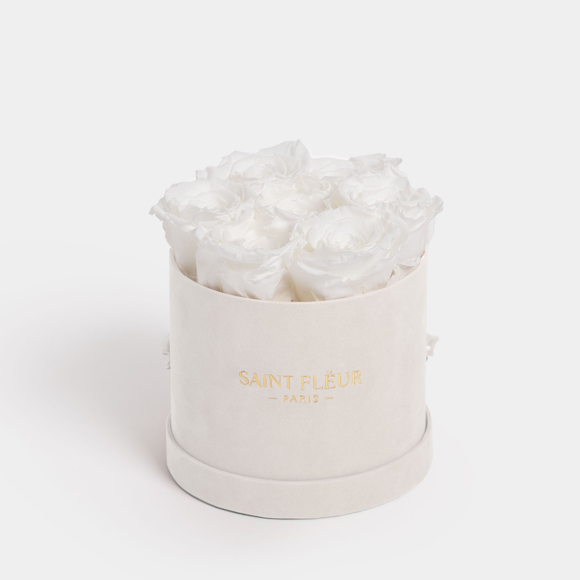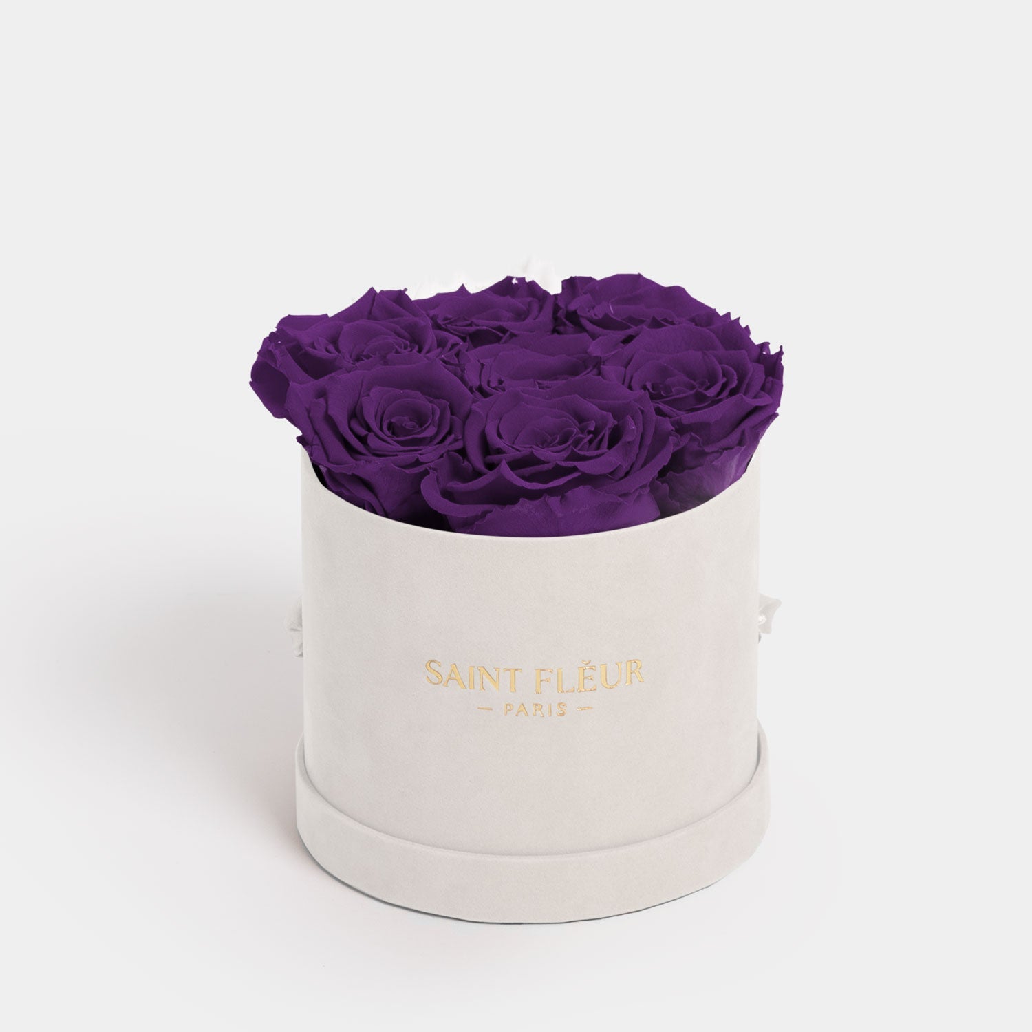 The 'Small Round' eternal rose arrangement by Saint Fleur captures luxury in its most compact form. It boasts seven lush, large-plus red roses, each preserved to perfection, and nestled in a timeless, round box. Designed for longevity, this piece serves as a daily reminder of beauty and grace.